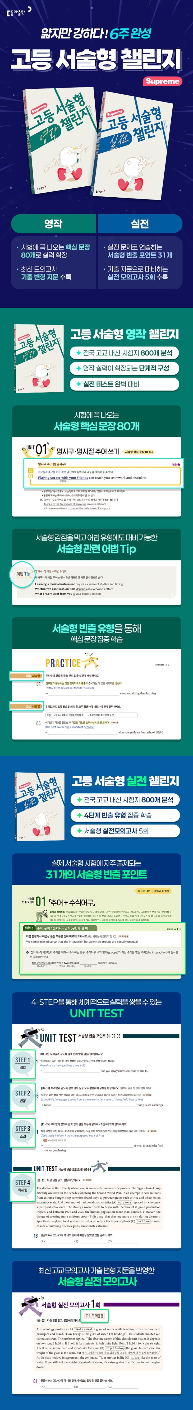 - 서술형 빈출 포인트를 집중 훈련할 수 있는 PRACTICE와 'STEP 1 배열〉 STEP 2 변형/추가〉 STEP 3 조건〉 STEP 4 독해형'으로 이어지는 4단계 빈출 유형으로 구성된 UNIT TEST을 풀어보며 체계적으로 실력을 쌓을 수 있습니다.
