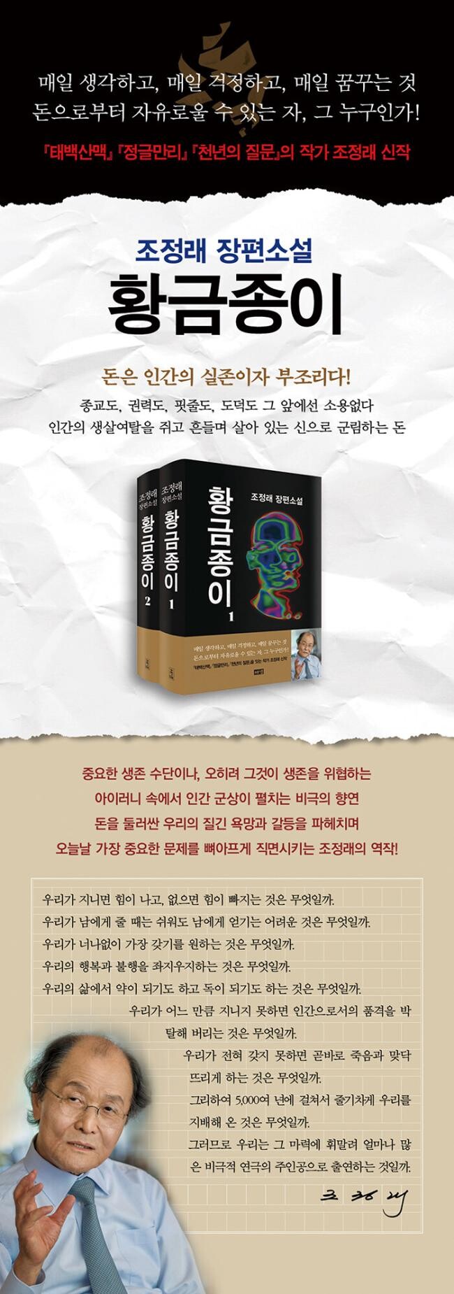 등단 50주년을 지나올 때까지 매순간 “문학은 인간의 인간다운 삶을 위해 인간에게 기여해야 한다”는 일념으로 역사와 사회 문제는 물론 개인의 실존까지 다양한 주제를 천착해 왔던 작가 조정래. 신작『황금종이』역시 그러한 문제의식의 연장선상에 있는 작품으로, 작가는 “돈은 도구이자 수단일 뿐, 인간을 지배할 수 없다는 철학성을 확보해야만 한 번뿐인 삶을 올바르게” 영위해 갈 수 있음을 강조한다.