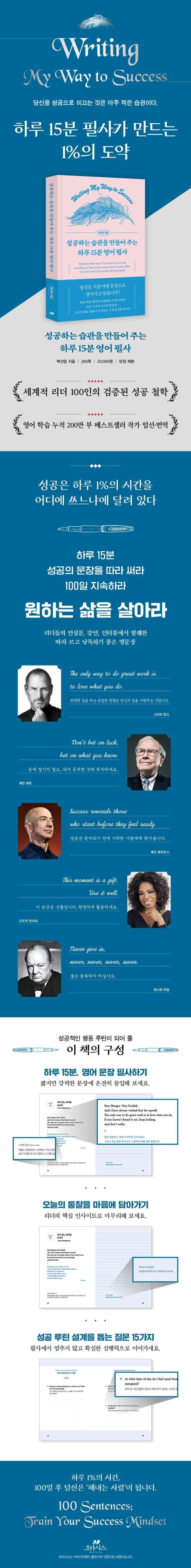 지금, 하루 1%의 시간을 어디에 쓰고 있는가? 당신을 위해 쓰고 있는가? ‘성공’을 원하면서도 삶을 이끌 분명한 언어와 철학이 없다면, 지금 바로 필사에서 시작해야 한다. 오늘 부자가 되지 않아도 괜찮다. 그러나 오늘 단 한 문장을 따라 쓰는 순간, 내일의 당신은 어제와 다른 사람이 된다. 당신의 언어, 당신의 성공은 하루 15분 영어 필사에서 시작된다.