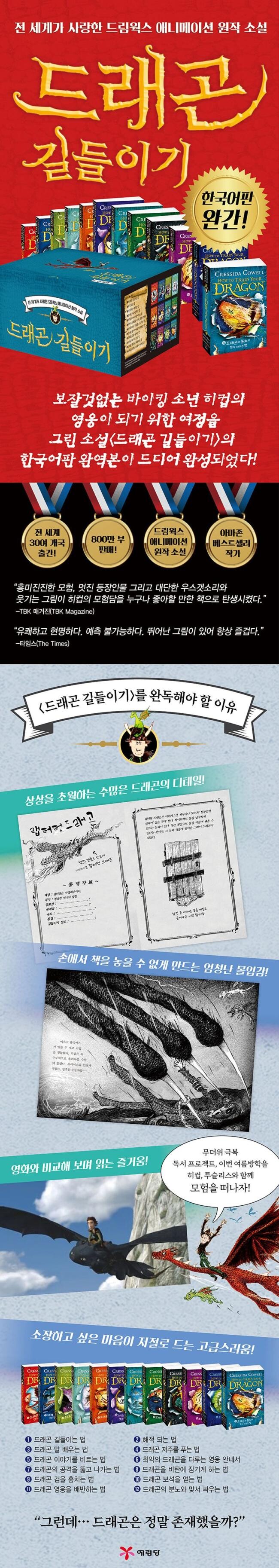 소년 히컵과 드래곤 투슬리스의 모험을 그려 많은 호평을 받은 드림웍스의 3D 애니메이션 〈드래곤 길들이기〉의 원작 소설이 드디어 완간되었다. 애니메이션 〈드래곤 길들이기〉는 1편이 개봉하자마자 북미 박스오피스 1위를 할 정도로 많은 사랑을 받았다. 원작 소설 〈드래곤 길들이기〉 시리즈는 영국을 시작으로 전 세계 30여 개국에서 출간, 800만 부 판매를 달성한 크레시다 코웰의 작품이다. 이번에 한국에서도 마지막 12권이 출간되어 전 12권이 완성되었다.