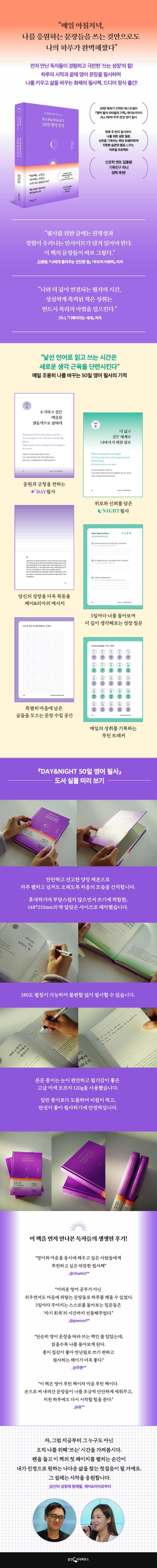 무엇보다 전에 없던 새로운 방식의 영어 필사를 제안한다는 점에서 이 책은 특별하다. 이 책은 하루에 두 번, 아침(Day)과 저녁(Night)에 각각 다른 문장을 필사하는 구성으로 이루어져 있다. 아침에는 응원과 긍정의 문장으로 하루를 열고, 저녁에는 위로와 신뢰의 문장으로 하루를 닫는다. 이렇게 하루를 완결성 있게 채워나가다 보면 어느새 목표를 향해 성큼 다가선 자신을 발견하게 될 것이다.