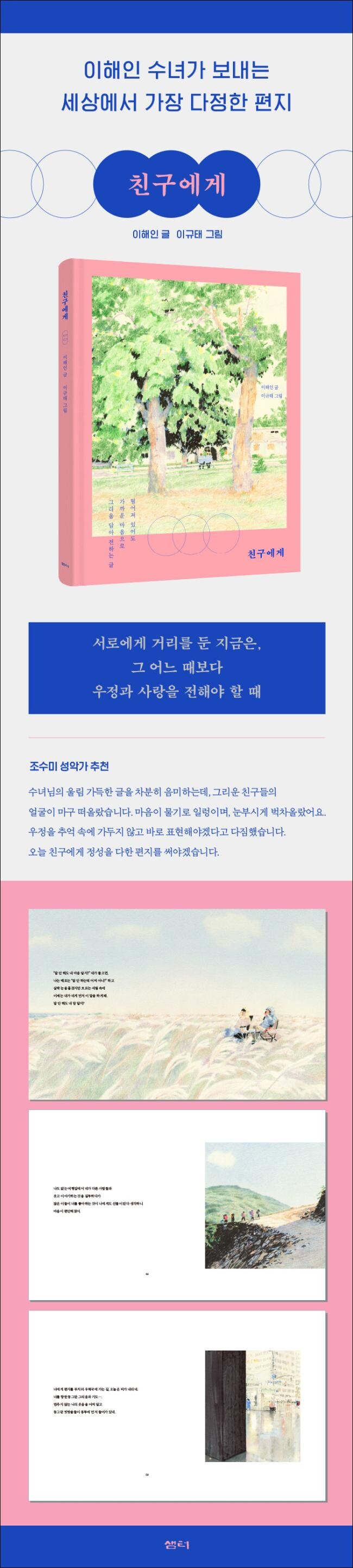 전 세계가 코로나19로 힘든 시기를 보내며 거리 두기를 실천하는 때이다. 이 시기 이해인 수녀가 우정을 다룬 뜻깊은 책을 선보인다. 수녀는 오히려 이 어려운 시기에 우정과 나눔의 중요성에 대해 생각해보게 되었다고 한다. 그렇기에 소중한 이들을 위해 물리적 거리 두기를 잘 지키면서도 마음을 멀리하거나 미루는 일은 없어야겠다고 말한다.