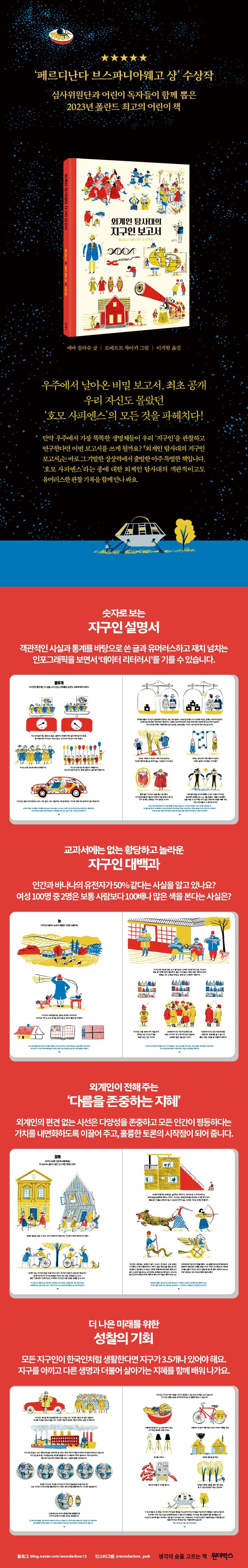 외계인의 시선은 우리가 무심코 지나쳤던 일상을 새롭고 흥미롭게 만듭니다. 지구인의 털은 침팬지와 비슷한 500만 가닥이지만 대부분 가늘어서 잘 보이지 않을 뿐이라거나, 음식을 먹을 때 손, 젓가락, 포크와 나이프를 쓰는 인구 비율이 거의 비슷하다는 등의 내용은 아이들의 호기심을 자극하기에 충분합니다.