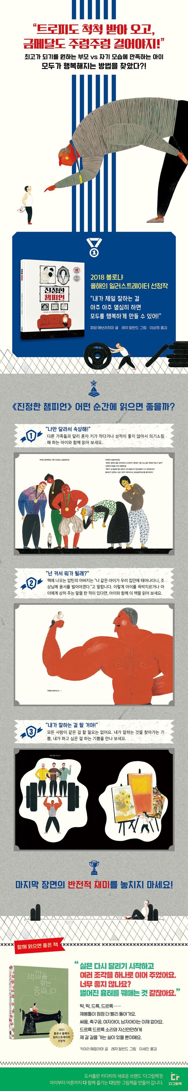 마지막 장면에서 액자 속 사람들의 표정과 압틴 아버지의 표정은 완전히 대조적입니다. 액자 속 사람들의 얼굴은 압틴이 기대하는 이상적인 모습이고, 액자 밖 아버지의 얼굴은 달라지지 않은 현실이지요. 우리의 현실에서도 아이는 자기가 잘하는 것에 집중하며 자기다운 삶을 살아가고자 하지만, 부모는 그것을 쉽게 받아들이지 못합니다. 그렇기 때문에 마지막 장면에 대한 아이와 어른의 반응은 다를 수 있습니다. 누군가는 통쾌함을, 누군가는 제 발 저림을 느끼지 않을까요? 이 책을 아이와 어른이 함께 봐야 하는 이유입니다. 과연 “진정한 챔피언”은 누구일까요?