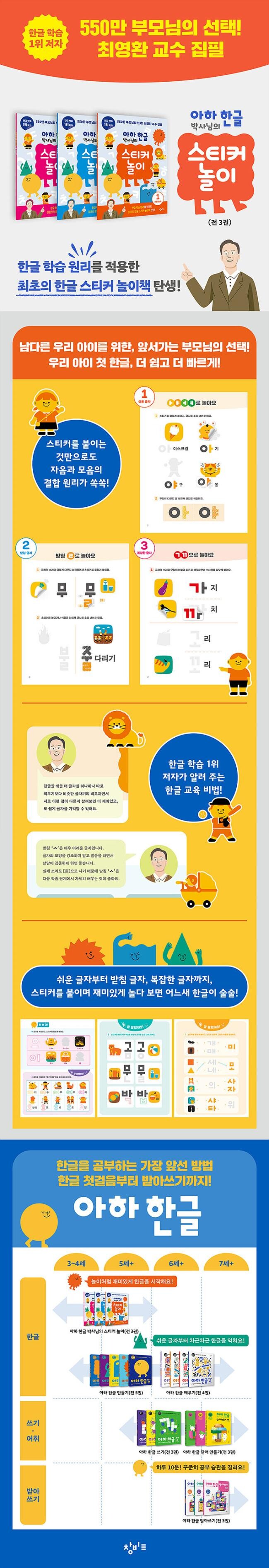 『아하 한글 박사님의 스티커 놀이』에는 1권 121개, 2권 113개, 3권 87개의 스티커가 포함되어 있습니다. 아이들이 좋아하는 스티커 붙이기 활동을 마음껏 할 수 있을 뿐만 아니라 스티커를 붙이는 동안 저절로 자음과 모음은 물론, 그 둘의 결합 원리를 배울 수 있습니다.
