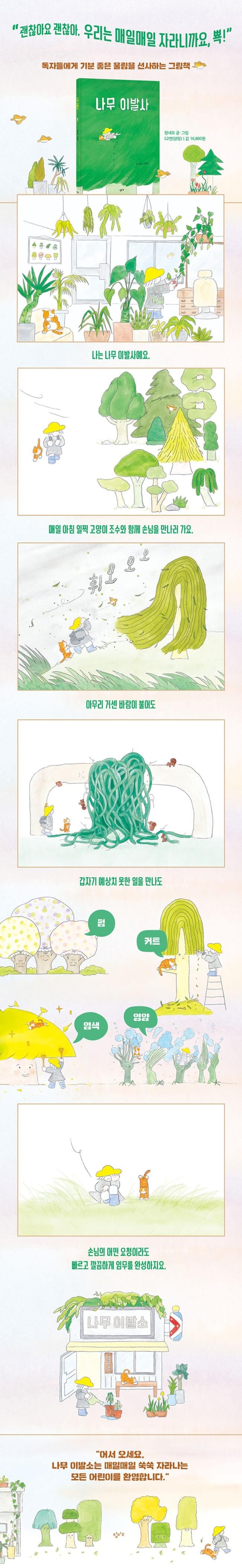4m가 넘게 펼쳐지는 아코디언북으로 시각적인 즐거움을 주는 데뷔작 『비가 올까 봐』(2020), 생일을 맞은 이에게 소원을 배달하는 생일초 초초의 이야기 『소원 배달부 초초』(2024)를 통해 작은 존재들을 향한 다정한 응원을 보내 온 그림책 작가 정네모가 이번에는 나무 이발사의 일상을 그림 그림책 『나무 이발사』(창비교육, 2025)로 독자들을 만난다. 『나무 이발사』 속 이발사는 동그란 나무, 뾰족한 나무, 키 작은 나무 등등 단골 나무들의 헤어스타일 고민을 해결하며 눈코 뜰 새 없이 바쁜 하루를 보낸다. 그런데 새로운 헤어스타일을 마음에 들어 하지 않는 손님이 등장하며 나무 헤어스타일 전문가인 나무 이발사에게 위기가 찾아오는데…. 나무 이발사는 오늘 하루를 무사히 보낼 수 있을까?