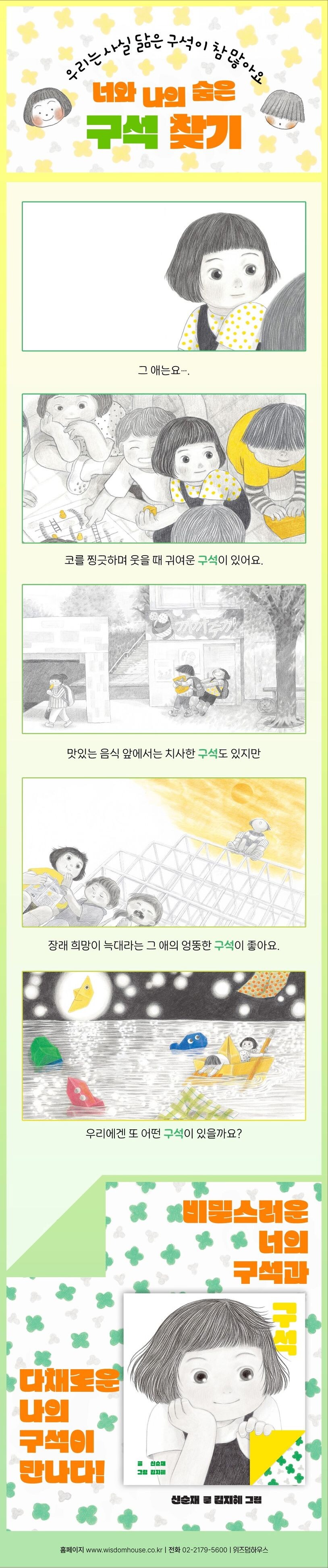 누구나 저마다의 다양한 구석들을 가지고 있습니다. 나만 아는 어리숙한 구석이나 나만 몰랐던 귀여운 구석들이 있기도 합니다. 때로는 어떤 구석을 숨기고 싶어 더 어둡고 눈에 띄지 않는 구석으로 쏙 숨어 버리기도 하지요. 작품 속 반짝거리는 눈빛을 한 주인공들은 함께 시간을 보내고 조금씩 가까워지면서 서로의 구석들을 찾고, 발견하고, 더 알아 갑니다. 우리에게는 또 어떤 구석들이 있을까요? 책장을 넘길 때마다 펼쳐지는 다양한 구석들을 따라가면서 나도 몰랐던 내 마음속 구석들을 만나 보세요.
