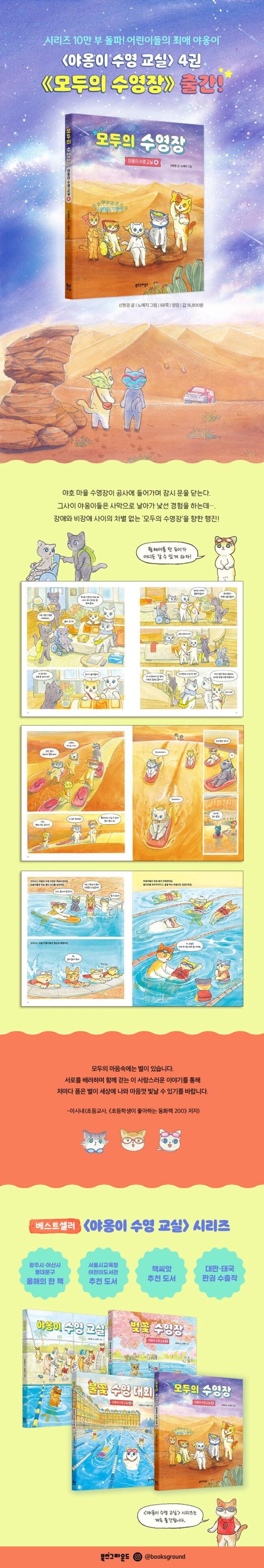 “야옹이들이 머나먼 사막까지 나가게 되었어요. 이게 다 수영을 배운 덕분이니, 배움은 역시 멋진 일이에요. 사막에서 별도 보고, 수영도 하는 야옹이들을 그리며 무척 즐거웠습니다. 우리 일상에서도 이 아름다운 여정을 모두가 함께할 수 있길 바랍니다. ” -노예지