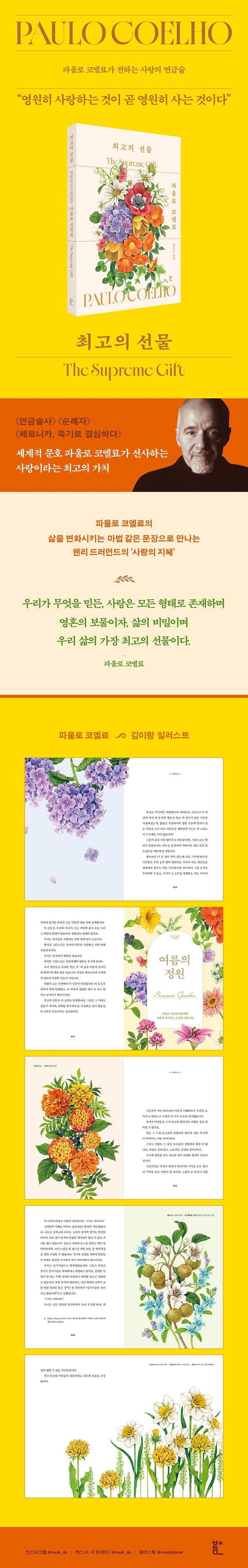 “우리 자신을 사랑하고, 모든 사람을 사랑”해야 하는 까닭은 사랑이라는 감정에서 ‘생명의 에너지’가 샘솟기 때문이다. 사랑만이 ‘나’와 ‘나’를, ‘나’와 ‘타인’을 잇는 접점이 되어주며, 그 ‘이해’라는 접점을 통해 내일을 살아가고자 하는 긍정적 기대가 생겨난다. 그러므로 파울로 코엘료는 세상의 모든 중요한 가치 위에 ‘사랑’을 두어야 한다고 말한다. “모든 나라의 화폐가 쓸모없어지고 가치 없어질 때, 사랑은 우주에서 여전히 받아들여지는 유일한 화폐”일 것이라고. 이 책은 독자에게 인생의 가치관이 바뀌고 세상을 대하는 태도를 새롭게 하는 값진 경험을 선사할 것이다. 더불어 글과 함께 실린 김이랑 작가의 ‘사계절 꽃의 정원’ 일러스트가 ‘최고의 선물’이라는 감동을 더한다.