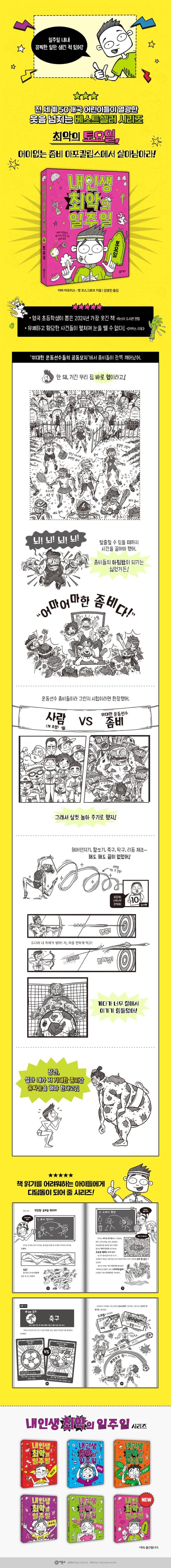 책이 어렵고 지루하다는 편견이 있는 어린이라도 「내 인생 최악의 일주일」 시리즈를 본다면 쿡쿡 터져 나오는 웃음을 참을 수 없을 것이다. 만화 일러스트가 곳곳에 들어가 긴 글을 읽기 힘들어하는 어린이의 부담을 줄여 준다. 현란한 컬러 그림이 가득한 학습 만화에서 줄글 책으로 넘어가는 디딤돌이 되어 주는 시리즈다. 좀비 떼를 피해 도망치는 모습을 비디오 게임처럼 표현하거나 좀비가 우글대는 공동묘지에서 조심할 점을 경고 표지판으로 그리는 등 곳곳에 들어간 유머가 코믹한 만화책을 보는 것처럼 독자를 정신없이 웃게 해 준다. 학교와 학원 등에서 쳇바퀴 돌 듯 보내는 일상에 지친 아이들을 즐겁게 해 줄 수 있는 책이다.