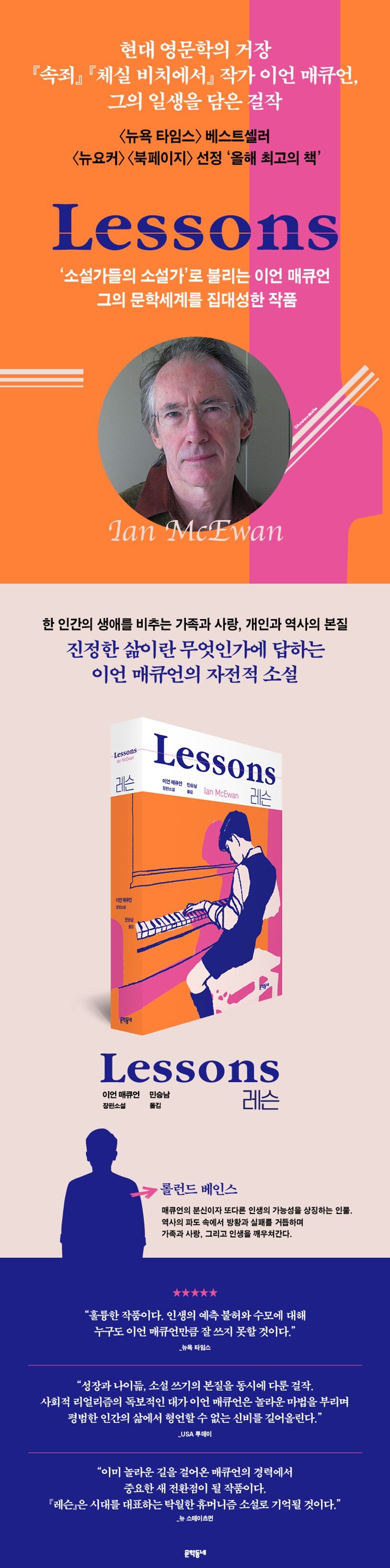 롤런드의 일생을 보고 있노라면 인생의 희로애락이 무엇인지 진정 체감할 수 있다. 어리석은 선택을 내리고, 후회하고, 삶의 강렬한 기쁨을 맛보았다가 좌절하는 그에게 우리는 연민과 공감을 던지게 된다. 그리고 700여 쪽에 이르는 그의 여정이 마침내 막을 내릴 때, 우리는 『레슨』이 주는 진한 여운에 찬사를 보내게 될 것이다.