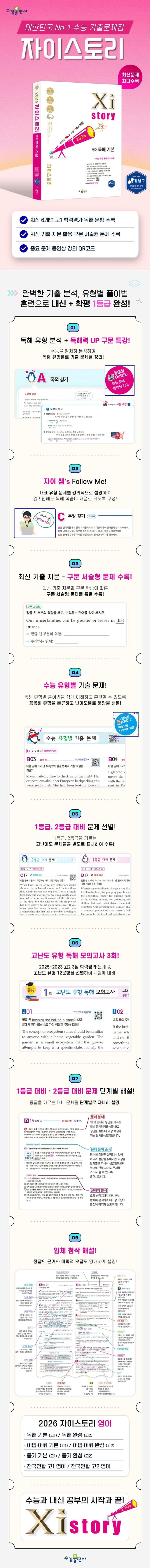 입시변수가 다양해졌지만, 영어 실력 향상은 언제나 최고의 결과를 보장합니다. 자이스토리는 영어 실력 향상을 위해 독해 문제를 유형별로 분류하고, 각 문제 유형에 맞는 이해 순서와 논리적 풀이법을 제공하여 빠르게 정답을 찾는 방법을 습득하도록 하였습니다.