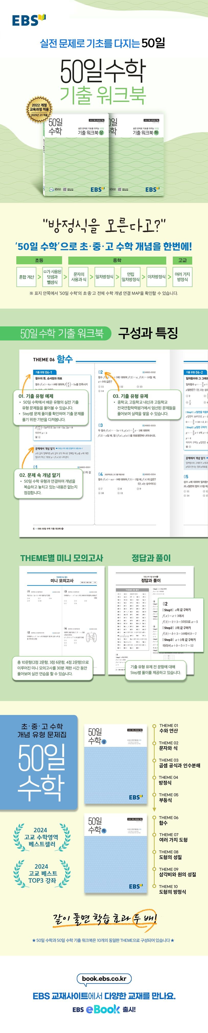 - 50일 수학과 동일하게 (상), (하) 총 10개 주제로 구성되어 개념 유형 학습과 실전 문제 풀이의 연계 학습이 가능합니다.