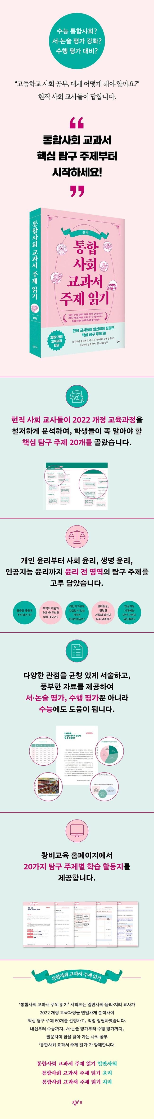 하지만 다행히 교육의 뿌리인 교육과정이 요구하는 것은 같다. 교과 내용을 학습하여 이를 구체적인 삶의 맥락에 적용해 사회 문제를 파악하고 해결할 수 있는 능력을 기르는 것이다. ‘통합사회 교과서 주제 읽기’ 시리즈(전 3권)는 바로 이 ‘사회 문제’, 즉 교육과정을 분석하여 뽑아 낸 ‘탐구 주제’에 집중했다. 이 시리즈 중 하나인 『통합사회 교과서 주제 읽기: 윤리』는 현직 윤리 교사 20명이 현장의 경험과 교과의 전문성을 살려 새 교육과정과 교과서를 면밀하게 분석해 윤리 영역의 주요 사회 문제를 파악하고, 이를 바탕으로 핵심 탐구 주제 20개를 선정하여 직접 내용을 집필하였다. 각 탐구 주제는 개인 윤리부터 사회 윤리, 생명 윤리, 인공지능 윤리까지 윤리 전 영역의 탐구 주제를 고루 담았다.