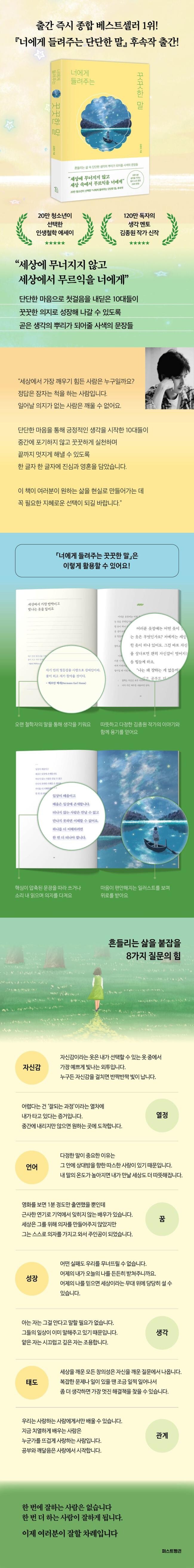 김종원 작가는 이렇게 말한다. “우리가 흔들릴 수 있다는 건 아직 무너지지 않았다는 뜻입니다. 생각하는 힘은 흔들림 속에서 자라납니다.” 그렇다. 『너에게 들려주는 꿋꿋한 말』은 흔들리는 10대들의 마음에 생각의 뿌리가 되어주는 깊고 다정한 사색의 문장들을 조용히 펼쳐놓는다. 그 문장들은 “괜찮다”는 위로이자 “너만의 길을 만들어갈 수 있다”는 격려이고 “너는 이미 소중한 존재”라는 응원이다. 비록 지금은 흔들릴지라도 김종원 작가가 건네는 꿋꿋한 문장들과 함께할 수 있다면 넓은 세상의 주인공으로 당당하게 서는 놀라운 내일과 만나게 될 것이다.