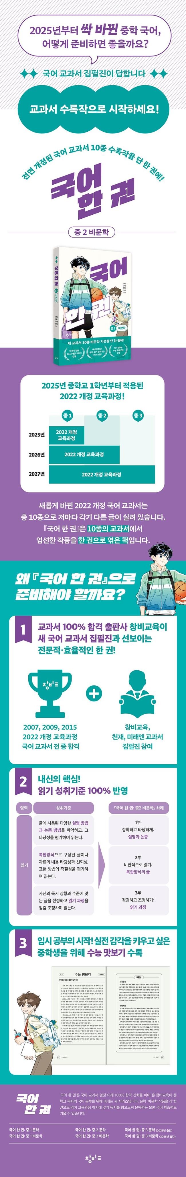 2025년, 교과서가 바뀌었다. 중 1부터 2022 개정 교육과정에 따라 새로 편찬된 교과서로 공부하게 된 것이다. 2026년에는 중 2가 새 교과서로 공부한다. 바뀐 학습 환경 속에서 학습에 대한 부담이 점차 커져 가는 중학교 2학년 학생과 학부모에게 개정 교과서는 또 다른 걱정이 아닐 수 없다. 이에 검정 교과서 100% 합격 신화를 이어 온 국어 교육 전문 출판사 창비교육이 중학생들의 손쉬운 중학 국어 준비를 돕고자 ‘국어 한 권’을 선보인다.