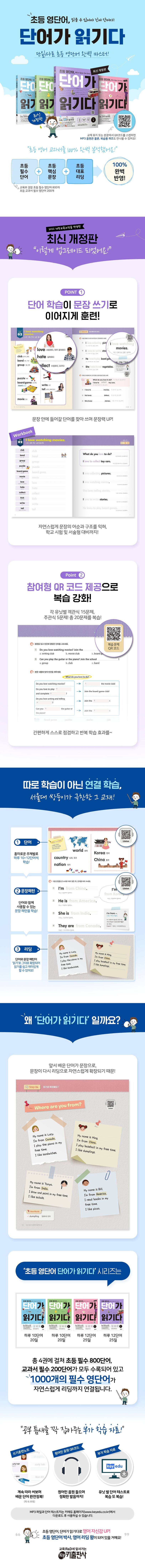 〈단어가 읽기다〉 시리즈는 단어를 단순히 암기하지 않습니다. 문장에서 자연스럽게 단어의 쓰임을 문장에서 익힐 수 있도록 구성되어 있습니다. 이러한 학습 과정을 통해 아이들은 단어의 의미와 쓰임을 자연스럽게 익히고, 문장을 해석하는 힘은 물론 읽기, 말하기, 쓰기 전 영역에서의 영어 감각까지 함께 키울 수 있습니다. 단어에서 문장, 문장에서 읽기로 이어지는 이 유기적인 시스템은 단순히 어휘량만 많은 아이가 아니라, 영어 문장을 정확하게 이해하고 표현할 수 있는 아이로 성장하게 돕습니다.