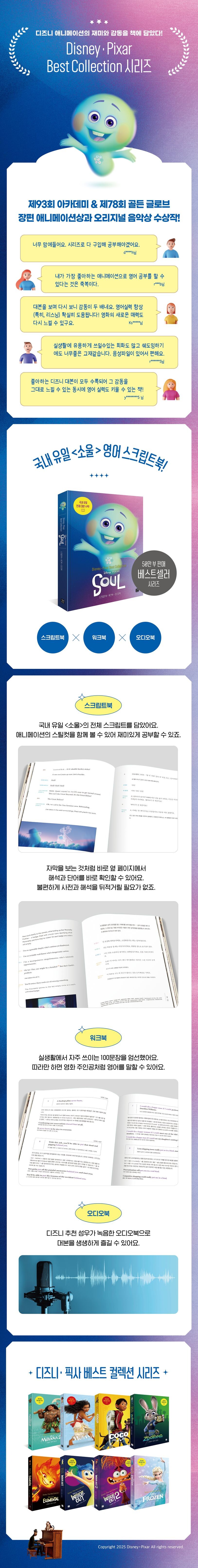 국내 유일 전체 대본 수록! 디즈니, 픽사 애니메이션 〈소울〉의 대본을 영화 그대로 대사와 지문까지 완벽 수록하였습니다. 제93회 아카데미 애니메이션상·음악상, 골든 글로브 2관왕에 빛나는 픽사의 걸작이자 로튼 토마토 95%, 메타크리틱 83점의 극찬 속에 전 세계 평단을 사로잡은 '소울'! 극장에서 느꼈던 감동을 대본을 읽으며 다시 한번 생생하게 느껴보세요.