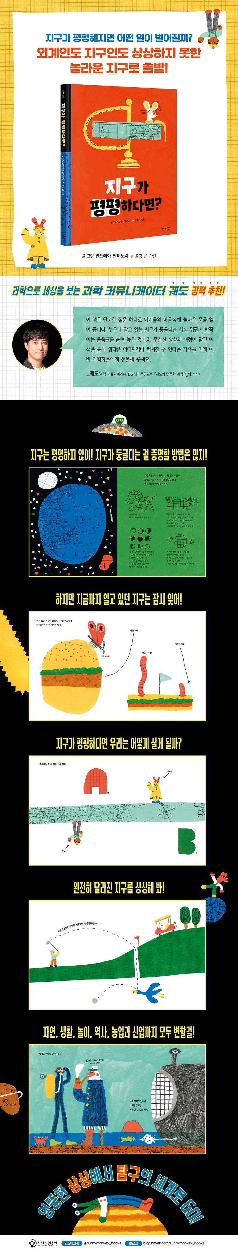 상상 놀이처럼 시작된 이야기는 과학, 역사, 사회 등 다양한 분야의 이야기로 이어져요. 지구가 평평해지면 지형도 변하고 자연물도 변할 거예요. 지구의 자전과 지구의 기울기도 모두 변할 수밖에 없지요. 애초에 지구가 평평했다면 타이태닉호 사건이나 콜럼버스의 신대륙 발견도 결과가 달라졌겠죠? 어떤 생물은 진화하기 위해 노력해야 할 거예요. 우리가 노는 방법, 운동하는 방법, 친구와 만나는 방법도 모두 달라질지도 몰라요! 지구의 모양이 바뀌면 세상 모든 것이 바뀌는 건 당연하니까요!