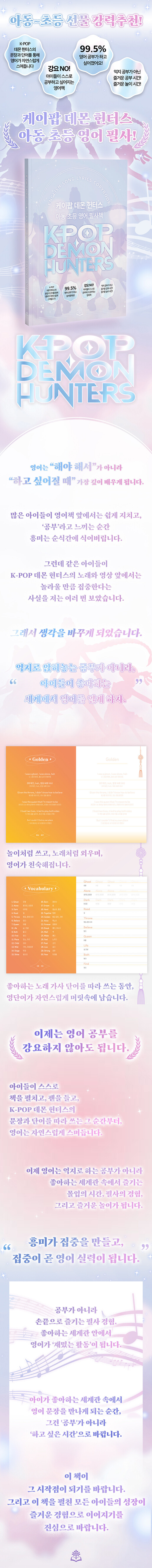 아이들이 좋아하는 《케이팝 데몬 헌터스》의 노래를 따라 부르고 써보며 자연스러운 문장과 표현을 익히고 살아 있는 영어 리듬을 몸으로 배웁니다. 가사 속 문장 패턴이 반복적으로 등장해 아이들이 문맥 속에서 표현의 의미를 스스로 깨닫고 읽기와 쓰기로 자연스럽게 확장할 수 있도록 구성했습니다.