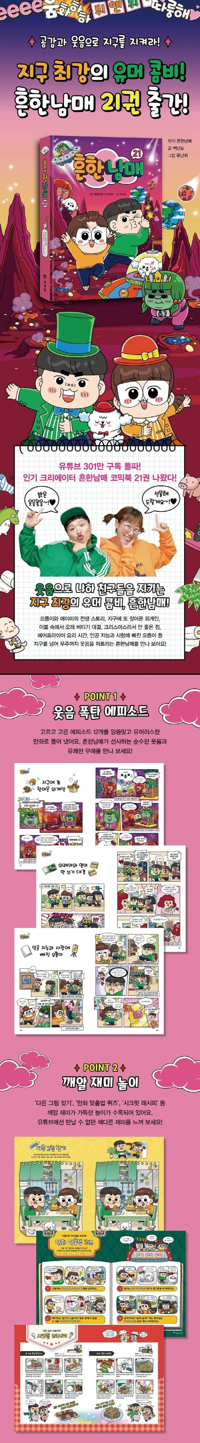 웃음으로 냐하 친구들을 지키는 지구 최강의 유머 콤비, 흔한남매!으뜸이와 에이미의 전생 스토리, 지구에 또 찾아온 외계인, 이불 속에서 오래 버티기 대결, 크리스마스라서 안 좋은 점, 에어프라이어 요리 시간, 인공 지능과 사랑에 빠진 으뜸이 등 지구를 넘어 우주까지 웃음을 퍼트리는 흔한남매를 만나 보아요!유튜브 301만 구독 돌파! 인기 크리에이터 흔한남매‘흔한남매’는 유튜브 구독자 수가 301만 명, 누적 조회 수가 41억 회를 넘어서는 인기 크리에이터로, 흔한컴퍼니에 소속되어 있습니다. 상황극.콩트 등을 통해 어린이들에게 큰 사랑을 받고 있으며, 주로 남매 사이에서 일어날 수 있는 현실적인 에피소드를 코믹하게 그려 내어 웃음과 공감을 이끌어 내고 있습니다.“흔한남매를 읽고 까르르 웃을 때가 제일 행복한 시간이래요.”‘유쾌한 우애’와 ‘순수한 웃음’, ‘따뜻한 공감’으로어린이들의 마음을 사로잡은 No.1 베스트셀러!