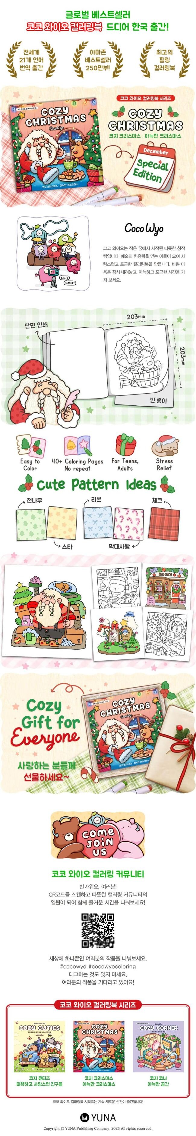 바쁜 하루 속에서 잠깐의 쉼표가 필요할 때, 색연필을 들고 마음이 가는 색으로 한 장을 채워보세요. 〈코코 와이오 컬러링북 시리즈〉는 단순한 컬러링북을 넘어, 당신의 하루에 따뜻함을 더해주는 작은 휴식의 공간이 되어줄 것입니다. 지금 바로 전 세계 250만 독자가 선택한 힐링 컬러링 경험을 만나보세요. 포근함과 귀여움이 가득한 <코지 크리스마스〉가 당신을 기다리고 있습니다.