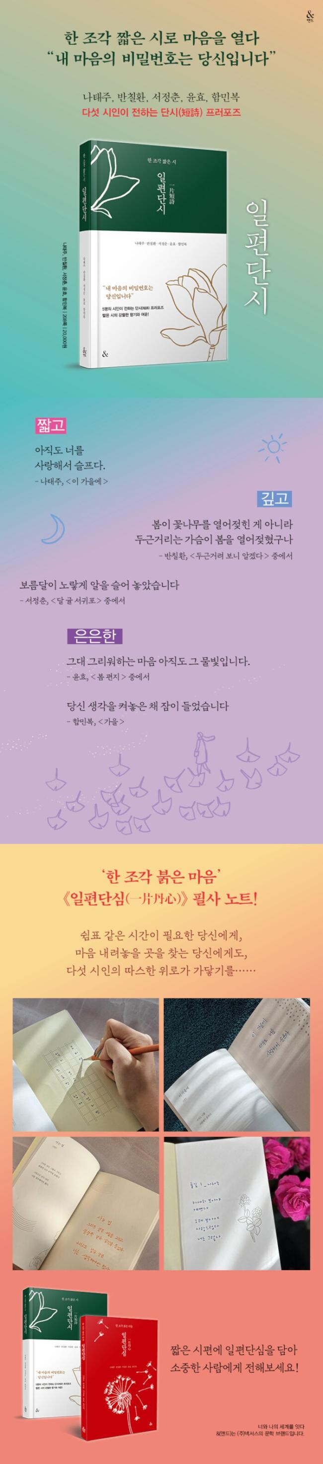 시를 다른 장르의 문학과 구별 짓는 가장 큰 특징은 바로 함축적이고 운율적인 언어로 표현한다는 점이다. 『일편단시(一片短詩)』는 시 중에서도 함축성과 여백의 미의 매력을 가장 잘 담고 있는 단시(短詩)만을 모아 독자에게 짧은 시의 진수를 감상하고 자신만의 감성으로 여백을 채워가는 경험을 제공하고자 한다.