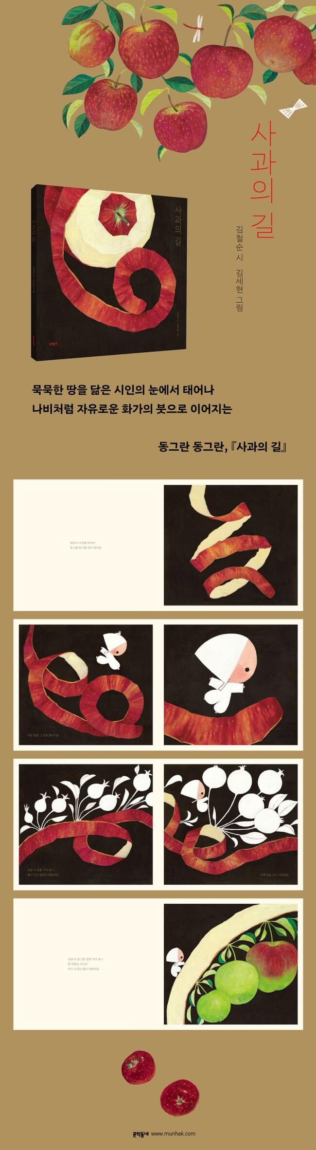 동시 「사과의 길」은 김철순 시인이 밭가에 심은 사과나무 두 그루에서 태어났다. 시인은 사과나무를 심기 전까지는 마트나 과일 가게에 있는 빨간 사과를 보며 주렁주렁 달린 걸 그냥 따 오기만 하면 되는 건 줄 알았다. 그러나 어린 나무가 꽃을 피우고 조그만 열매를 달아 키워 내는 모습을 보면서, 사과도 살아 내고 있구나 하는 감각을 처음 느꼈다. 꽃피던 시절과 태풍 부는 시절을 꾀부리지 않고 통과한 사과의 무르익은 시절을 이 동시에 담았다. 그림책 『사과의 길』은 그 시에서 태어났다. 시가 열어 주는 길을 따라 화가의 붓이 나아가며 춤을 추었다. 이제 이 그림책에서, 책을 통과한 우리들이 태어난다. 잘 익은 사과의 달콤한 맛을 입안에 가득 머금고.