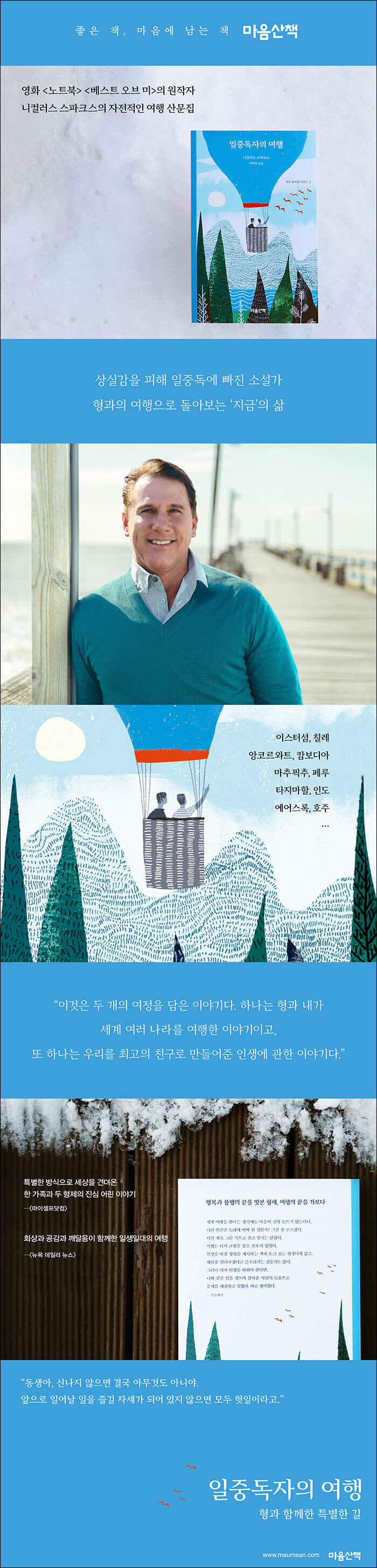 고된 인생 역정을 겪은 후 스스로를 일에 유배했던 니컬러스 스파크스는, 소설을 쓰고 다섯 명의 자녀를 키우며 바쁘게 살아가다 우연히 대학 동창회에서 소개하는 여행 프로그램을 보고 형과 훌쩍 3주간의 세계 여행을 떠난다. 일중독에서 빠져나와 삶과 화해하기 위해, 세상에 하나밖에 남지 않은 혈육인 형과 가족을 이해하기 위해. 칠레의 이스터섬, 캄보디아의 앙코르와트와 킬링필드, 페루 마추픽추, 인도 타지마할 등 호화로운 여행과는 거리가 먼 이국의 유적을 돌며 세상엔 다양한 인생과 고난이 있고, 그러면서도 삶은 계속됨을 깨닫는다. 세계적인 베스트셀러 작가 이전에 부모이자 아들 그리고 누군가의 동생임을 자각해가는 한 소설가의 자전적인 이야기가 독자들에게 주변을 돌아보고 삶의 희망을 찾을 계기를 마련할 것이다.