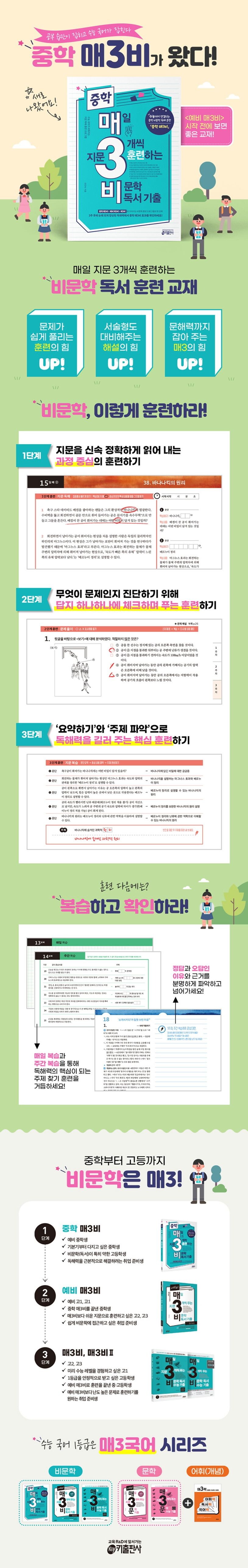 『중학 매3비』로 국어 공부를 시작하면 실전의 기본서가 되는 『예비 매3비』를 수월하게 공부할 수 있고, 나아가 실전 훈련의 핵심이 되는 『매3비』도 비교적 쉽게 공부할 수 있고,