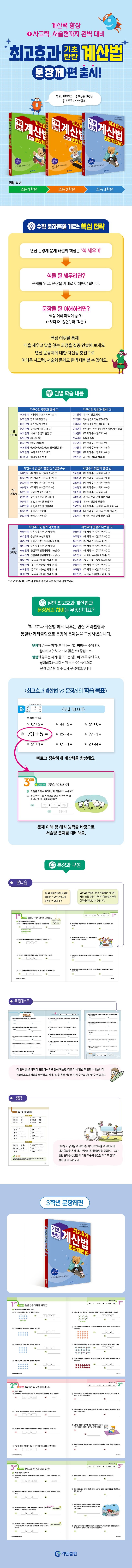 ‘최고효과계산법-문장제편’에서는 덧셈과 뺄셈에 집중하여 늘어나고 줄어드는 셈, 두 수의 합과 차, 상대비교(~보다 더 ‘많은’ 또는 ‘적은’ 수) 중심으로 핵심 어휘를 연습합니다.