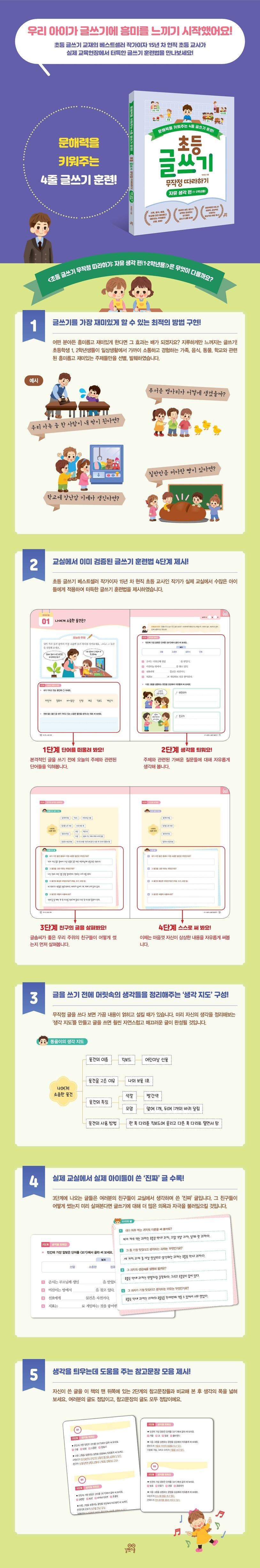어떤 분야든 딱딱한 형식과 규칙에 맞춰 실천하라고 하면 할수록 더 하기 싫어지는 게 인간의 본성입니다. 글쓰기도 마찬가지입니다. 이 책은 이제 막 첫 글쓰기에 도전하려는 초등학교 1, 2학년 아이들이 어떤 형식과 규칙에 얽매이지 않고, 자신의 생각을 자유롭게 써보면서 글쓰기 실력을 향상시킬 수 있도록 구성한 교재입니다.