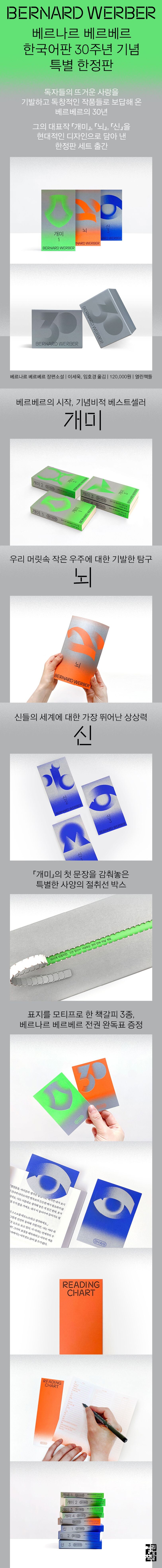 <베르나르 베르베르 한국어판 30주년 특별판>은 소프트커버로 이전보다 가뿐해졌다. 작가의 전작과는 다른 결의 심플한 타이포그라피와 과감한 그래픽을 적용했는데, 30년 전에 쓰인 미래적인 이야기와 어우러진 현대적인 이미지는 독자를 그 가운데 어떤 지점으로 단숨에 데려갈 것이다. 그의 작품을 사랑하는 독자들이라면 『개미』의 삼각뿔이나 『신』의 거대한 눈 속에 숨은 의미를 발견하는 즐거움 또한 누릴 수 있으리라. 세트 박스의 절취선을 뜯으며 가장 먼저 만나게 되는 것은 작가의 첫 소설 『개미』의 첫 문장으로, 이번 특별판 세트를 관통하는 작가의 <알쏭알쏭>한 메시지다. 「아시게 되겠지만, 그건 당신이 기대하는 것이 전혀 아닐 게요.」(열린책들 디자인팀장 함지은