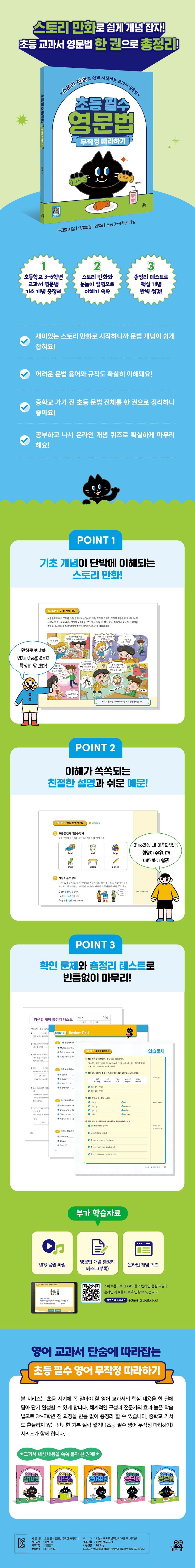 초등학교 3~6학년 교과서에 담긴 문법을 모두 모아 한 권에 담았어요. 2개월 단기 학습으로 초등 필수 영문법 기초 개념을 확실하게 습득해요.