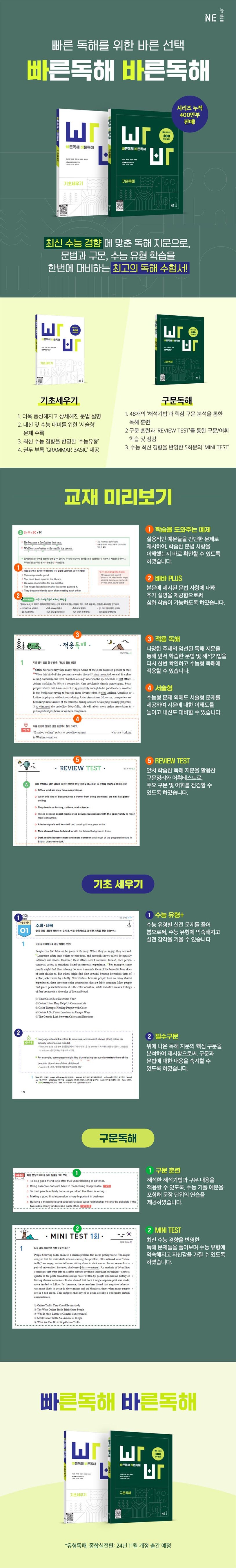 빠른독해 바른독해 <구문독해>는 ‘실제 사용에 기반한 사례별 구문 학습’을 목표로 구성되었습니다. 개별 문법 지식을 나열하거나 형식적인 독해 지문을 제시하기보다는 독해를 하면서 필요한 대표 구문들을 사례별로 모아, 이를 48개의 해석기법으로 만들었습니다.