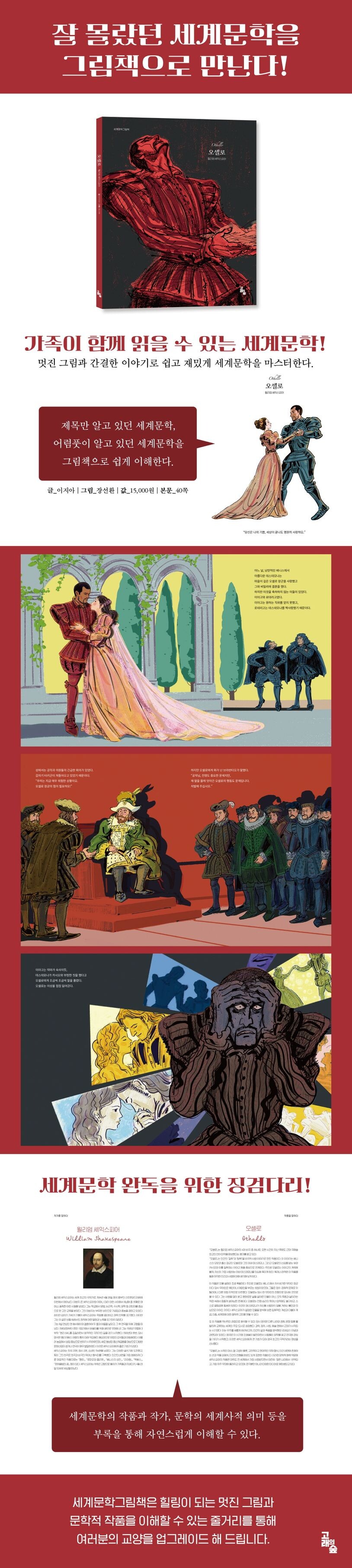 이 작품은 베니스의 모로코 출신 장군인 오셀로와 그의 아내 데스데모나, 그리고 오셀로의 신임을 받는 부관 카시오와 원하는 직책을 얻지 못해 질투하는 이아고 등의 인물을 중심으로 전개된다. 이아고의 계략에 빠져, 주인공 오셀로는 자신이 가장 사랑하는 아내 데스데모나를 의심하기 시작하고 결국 비극적 결말에 이른다. 이 작품을 통해 독자들은 허약한 인간과 사랑에 대해 생각해 볼 기회를 가지게 될 것이다. 『오셀로』는 시적인 대사, 잘 구성된 플롯, 고전적이고 현대적인 무대 형식, 인간 내면에 존재하는 선과 악을 파헤쳐, 인간의 전형을 완성도 있게 표현한 작품이다. 이러한 문학적 매력 덕분에 셰익스피어의 작품은 아직도 전 세계에서 가장 사랑받으면서 여전히 많은 나라에서 번역되고, 가장 자주 무대에 올려지고 있으며, 연극뿐만 아니라 다양한 미디어로 재탄생되고 있다.