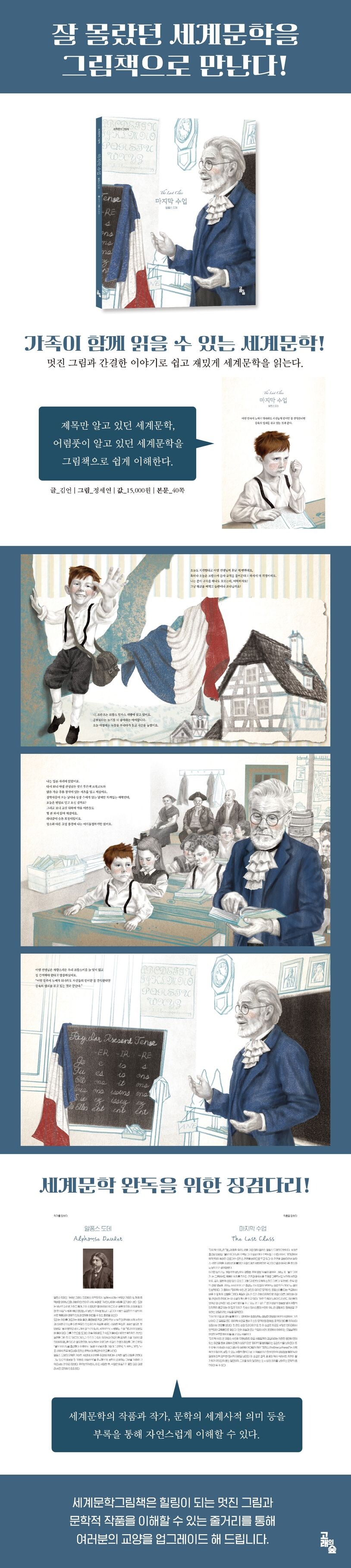 4. 시대·작가·작품을 잇는 해설 19세기 말 프랑스-프로이센 전쟁 이후의 역사적 상황, 알퐁스 도데의 삶과 문제의식, 그리고 『마지막 수업』이 근대 국민문학과 교육 서사에서 차지하는 문학사적 의미에 대한 해설을 함께 수록했다. 이를 통해 독자는 이 짧은 이야기가 왜 지금까지 읽히는 가치 있는 소설인지 자연스럽게 이해할 수 있을 것이다.