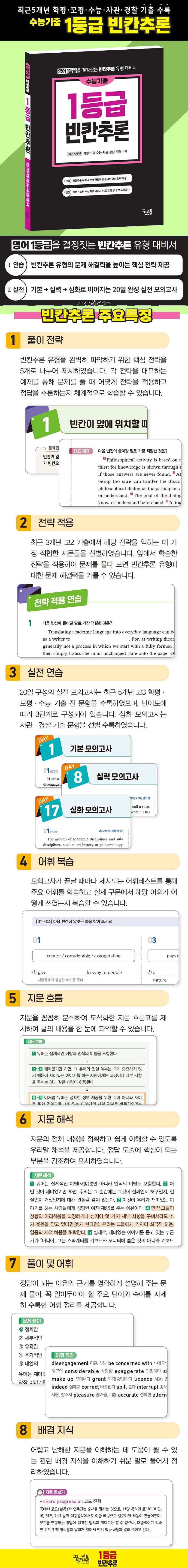 빈칸추론 유형을 완벽히 파악하기 위한 핵심 전략을 5개로 나누어 제시하였습니다. 각 전략을 대표하는 예제를 통해 문제를 풀 때 어떻게 전략을 적용하고 정답을 추론하는지 체계적으로 학습할 수 있습니다.
