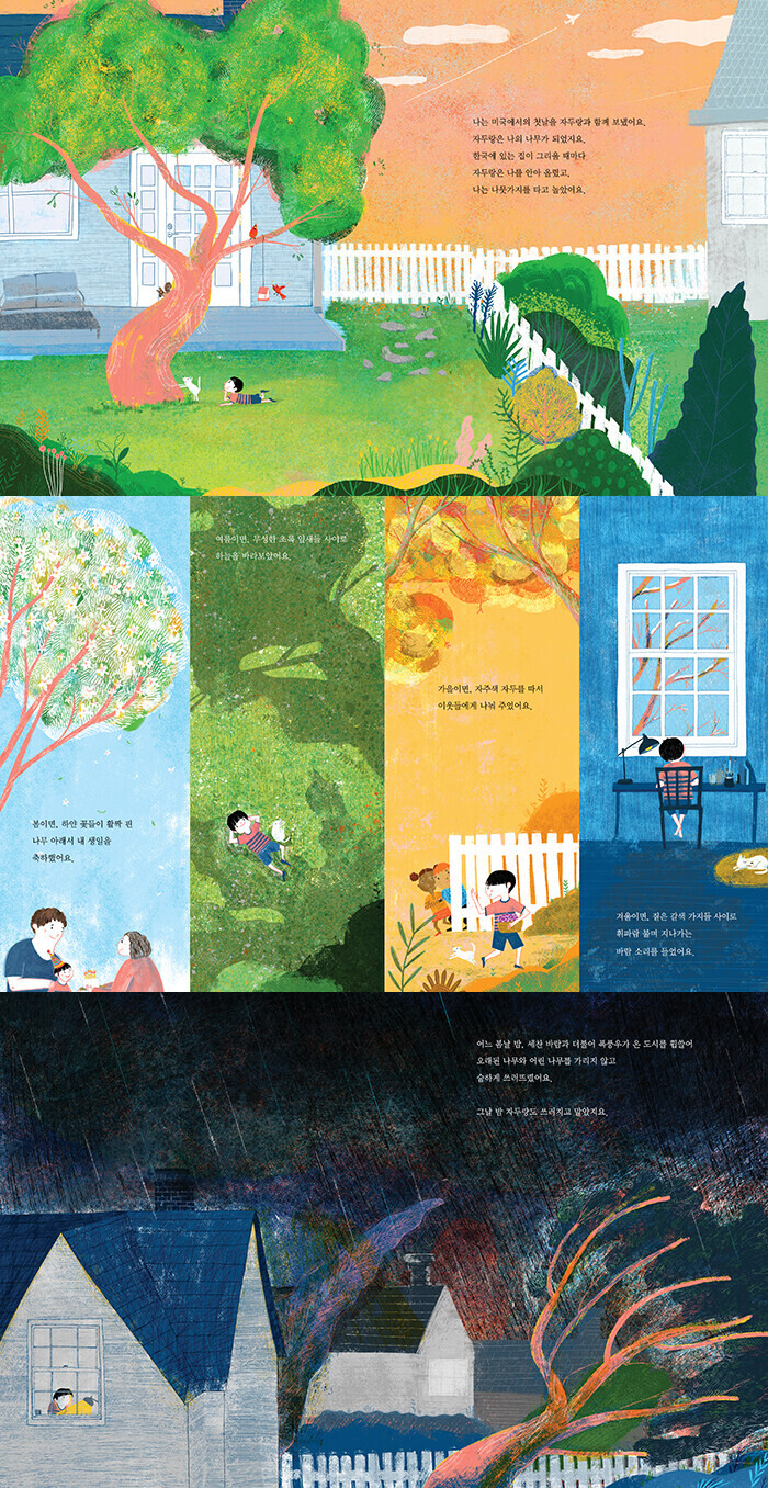 새로 이사한 집 뒷마당, 호젓하게 서 있는 오래된 나무 한 그루. 봄이면 활짝 피어나는 하얀 꽃들, 여름이면 무성한 초록 잎새들 사이로 보이는 파란 하늘. 그 풍경 너머로 응축된 시간의 흐름이 넘실거린다. 아이는 한국에 두고 온 것들이 그리울 때면 가지마다 자두가 조랑조랑 달린 나무에게 달려간다. 나무는 언제든 아이를 안아 올리고, 아이는 나뭇가지를 타고 논다. 아이에게 ‘자두랑’이라는 애칭을 얻은 나무는 그야말로 ‘나의 나무’가 되었다.