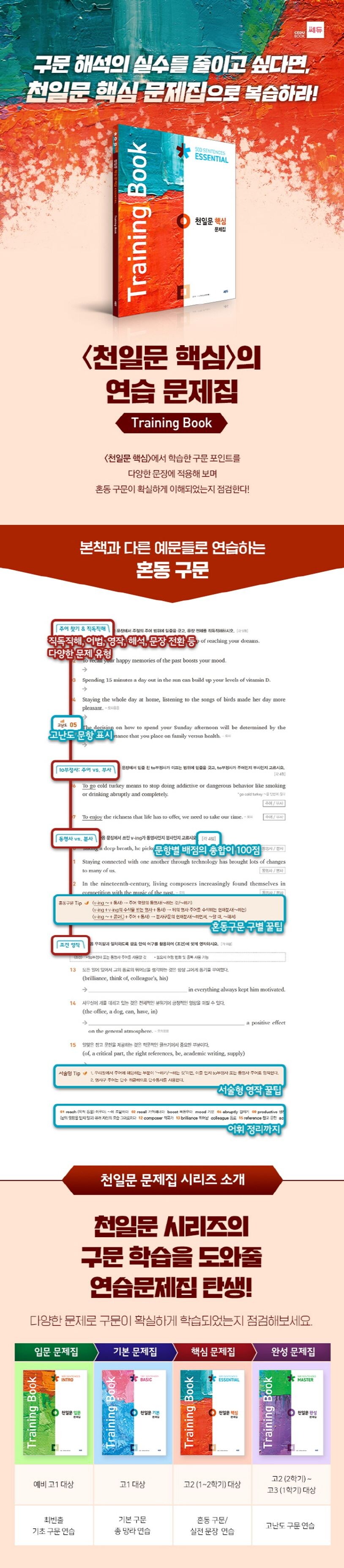 <천일문 핵심 문제집(Training Book)>은 <천일문 핵심>의 연습문제집으로, 본책과 다른 문장이 수록되어 있어 해당 구문을 담은 더 다양한 문장을 접할 수 있으며, 구문이 확실하게 학습이 되었는지를 점검해 볼 수 있다. 직독직해, 어법, 영작, 해석, 문장 전환 등 다양한 유형으로 구성되어 있다. 형태는 같지만 의미가 다른 구문을 판별하는 방법과 잘못 이해하기 쉬운 문장의 정확한 해석법을 학습할 수 있다. 구문 해석의 실수를 줄이고 싶다면 천일문 핵심 문제집으로 꼭 복습하길 추천한다.
