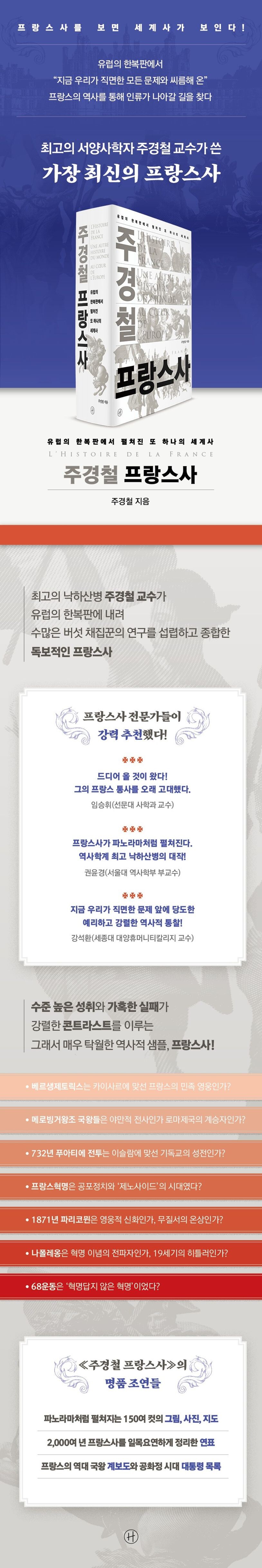 드디어 올 것이 왔다! 통사라는 큰 과제에 용기를 내주어 고맙다. _임승휘(선문대)수많은 버섯 채집꾼의 연구를 섭렵하고 종합한 최고 낙하산병의 대작! _권윤경(서울대)지금 우리가 직면한 문제 앞에 당도한 역사적 통찰! _강석환(세종대)탄탄한 연구를 기반으로 오랫동안 대중에게 역사 읽기의 즐거움을 선사해 온 서양사학자이자 역사 스토리텔러 주경철 교수가 2026년 2월 은퇴를 앞두고 지난 40년의 연구를 총망라해 프랑스사 전체를 조망한 통사를 내놓았다. 갈리아 문명의 탄생에서 왕국의 등장, 프랑스혁명과 세계대전을 거쳐 21세기 오늘에 이르기까지 2,000여 년 프랑스사를 조망한 이 책은 ‘피로 만든 다양성의 나라’ 프랑스가 내부의 분열과 외부의 압박을 이겨 내고 현대 세계 문명의 주역으로 발돋움하는 과정을 1,000쪽에 이르는 방대한 분량으로 엮어 냈다. 통사라는 무게에 걸맞게 진지하면서도 특유의 위트도 놓치지 않은 주경철 교수의 글쓰기는 전환기를 맞이한 한국 사회에 세계사적 통찰을 안겨 줄 것이다.최고의 낙하산병 주경철 교수가수많은 버섯 채집꾼의 연구를 섭렵하고 종합해 내놓은각국사의 새로운 전범―낡고 오래된 프랑스사를 대체하는 가장 최신의 통사―장구한 역사적 흐름 속에서만 발견할 수 있는 인사이트주경철 교수는 독보적 연구와 역사 대중화라는 두 마리 토끼를 모두 잡은 보기 드문 역사학자다. 그런 그도 프랑스사를 쓰는 일은 쉽지 않았다. 자신의 연구 분야를 넘어 통사를 쓰는 것은 역사학자라면 한번 꿈꿔 볼 수는 있지만 실행에 옮기기는 참으로 어려운 일이기도 하다. 그래서 프랑스사만 하더라도 최신의 연구 성과와 오늘의 성찰을 담은 마땅한 텍스트가 없다.하지만 장구한 역사적 흐름 속에서 봐야만 보이는 것들이 있다. 아무리 중요한 사건이라도 긴 시간 여러 일들의 누적 속에서 파악해야만 ‘우상화’를 범하지 않을 수 있기 때문이다. 저자는 프랑스사 전체를 관통하는 관념적 주장은 가급적 피하고, 특정 사건이 엄청난 역사적 굴절을 가져왔다는 식으로 단정하지 않으며, 지난 시대 역사가들의 논의 위에 새롭게 입혀진 최신의 연구를 적극적으로 소개하고, 독자들에게 흥미진진한 역사 경험의 재료를 잘 요리해 내놓음으로써 역사 읽기의 즐거움과 효용을 만끽하게 한다. 여기에 더해 그의 글 사이사이에 결들인 150여 컷의 도판과 지도, 책 말미에 실은 연표와 계보도는 독자에게 음료와 디저트가 되어 줄 것이다.특히 각국사가 또 하나의 세계사로 읽히도록 한 주경철 교수의 폭넓은 시야와 노련한 역사 기술은 가히 탁월하다. 그의 바람대로 이 책을 계기로 역사의 큰 흐름을 정리하는 여러 시도가 이어지길 기대한다.수준 높은 성취와 가혹한 실패의 콘트라스트가 강렬한그래서 매우 탁월한 역사적 샘플, 프랑스사!―246가지 치즈만큼이나 다양한, 폭력과 품격이 길항하는 프랑스―근현대 문명의 격정적 실험실을 읽는 천 개의 시선프랑스는 매우 넓은 국토에서 문화적으로 지극히 다양한 사람들이 교류하고 충돌하는 과정을 겪었다. 그 결과 다른 어느 나라와도 비교하기 힘든 수준 높은 성과들을 얻었다. 정치적으로 유럽 최강국 지위를 누리기도 했고, 계몽주의 시대 루소와 볼테르, 몽테스키외 같은 사상가들을 배출하며 유럽의 문화를 이끌기도 했다. 프랑스혁명을 통해 현대 사회에 직접 영향을 미칠 제도들을 시험했으며, 흑인 노예 해방이라는 인류애 넘치는 원칙을 최초로 선포했다. 그렇지만 이 나라가 그런 긍정적 측면만 갖고 있는 것은 아니다. 루이 14세와 나폴레옹의 시대는 끊임없이 주변 국가들을 침략하여 거의 히틀러 시대와 유사한 성격을 띤다고 해도 과언이 아니다. 프랑스혁명은 국가 권력이 지방 주민들을 가혹하게 학살한 제노사이드에 가까운 측면도 드러냈다. 아프리카와 아시아에 제국주의 침략을 하여 비인도적 학살과 고문을 자행하기도 했다. 이처럼 프랑스는 완전히 선한 나라도, 완전히 사악한 나라도 아니다. 그 두 측면들을 다 가지고 있되 그 양태가 강렬하여 콘트라스트가 매우 강한 흥미로운 경험을 보여 준다.이 강렬한 대비는 아주 흥미롭고도 탁월한 역사적 샘플이 되어, 지금 우리 앞에 즐비한 여러 문제에 대해 통찰을 준다. 특히 그동안 통념처럼 자리 잡은 지난 시대 연구를 넘어 최신 연구와 주경철 교수만의 예리한 해석을 곁들여 프랑스사, 나아가 유럽사를 읽는 새로운 시선을 제공한다.루이 14세는 프랑스사에서 특출한 의미를 띤다. 1643년에서 1715년까지, 72년 3개월 18일의 재위 기간은 프랑스 역사상 최장 기록이다. 이 긴 기간 동안 프랑스는 유럽 내 최강국의 지위를 누렸다. 루이 14세의 치세는 프랑스가 정치 군사적으로 그리고 문화적으로 패권을 차지한 시기라 할 수 있다. 각국에서는 베르사유궁을 모방한 궁전들을 짓고 왕실과 고위 귀족들은 프랑스어를 배워 대화했다. 그는 자신과 가문의 영광을 추구하며 스스로 알렉산드로스에 비견할 만한 위대한 군주로 기억되는 것이 꿈이었으나, 그것을 위해 프랑스와 이웃 국가 주민들은 심대한 고통을 치러야 했다. 치세의 절반을 전쟁으로 보냈으며, 위그노