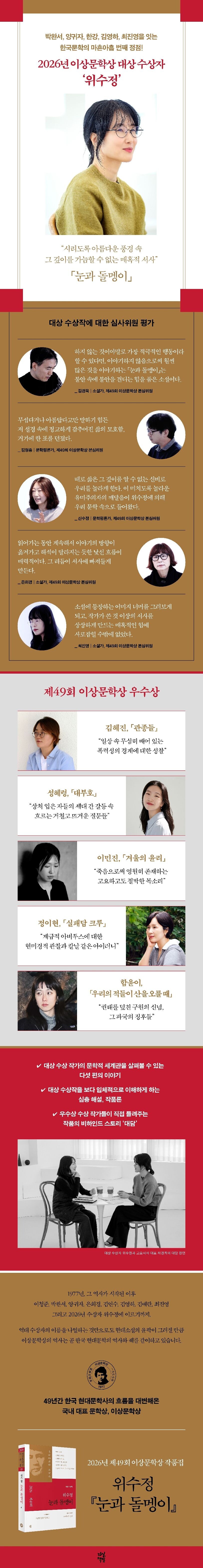 그리고 늘 ‘돌’로 돌변할 수 있는 ‘눈’의 메타포를 짚어내며 “그래서 사는 게 더 매혹적인 것”이고, “이 미치도록 놀라운 유미주의자의 깨달음이 위수정에 의해 우리 문학 속으로 들어왔다”며 기뻐했다.