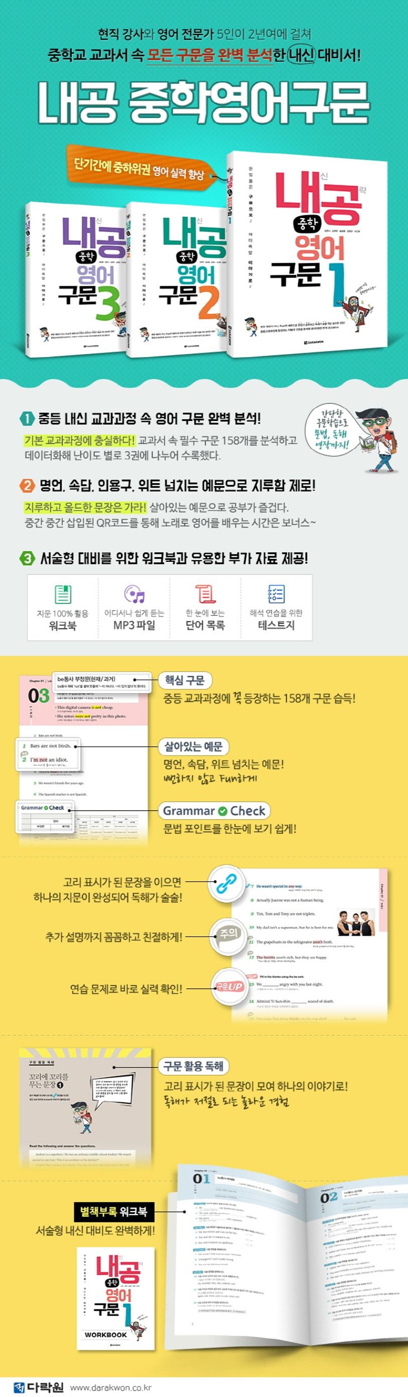 [내공 중학영어구문] 시리즈는 중등교과과정에 등장하는 모든 구문을 분석 데이터화해, 핵심 구문을 뻔한 예문이 아닌, Fun한 예문으로, 지루하지 않게 문법이 습득되고 독해가 술술 되는 놀라운 경험을 제공하는 본격 내신대비서이다. 내신 교과과정의 필수구문 158개를 1권 59개, 2권 52개, 3권 47개로 나누어 수록하고 있다. 본책은 기본적으로 15개 예문으로 구성되어 있으며 예문의 난이도는 뒷번호로 갈수록 약간씩 높아지도록 구성하였다. 워크북은 본책에서 학습한 문장을 활용하고 난이도가 다른 세가지 유형의 문제로 구성되어 있으며, 영작과 내신 서술형 대비가 가능하도록 구성하였다. 중등 교과과정의 간단한 구문 학습으로 영어 기초 확립과 문법, 독해, 영작까지 가능하도록 구성하였다.