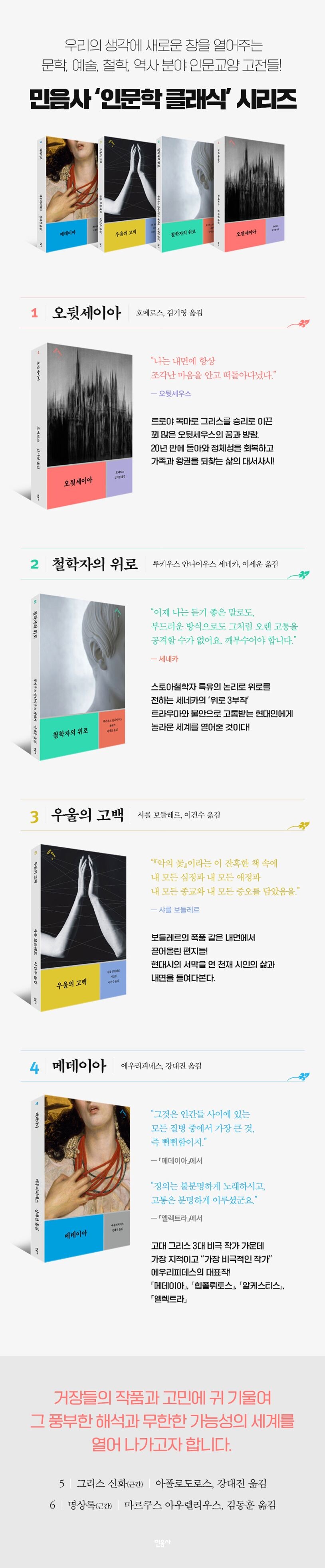 고전은 끊임없이 재발견되어야 합니다. 민음사는 독자와 함께 전통 위에서 새로운 가치를 창조하고자 합니다. 문학과 예술, 철학과 역사를 아우르는 인문교양(Liberal Arts) 고전들은 우리의 생각에 새로운 창을 열어줍니다. 거장들의 작품과 고민에 귀를 기울임으로써, 그 풍부한 해석과 무한한 가능성의 세계를 열어나가고자 합니다.
