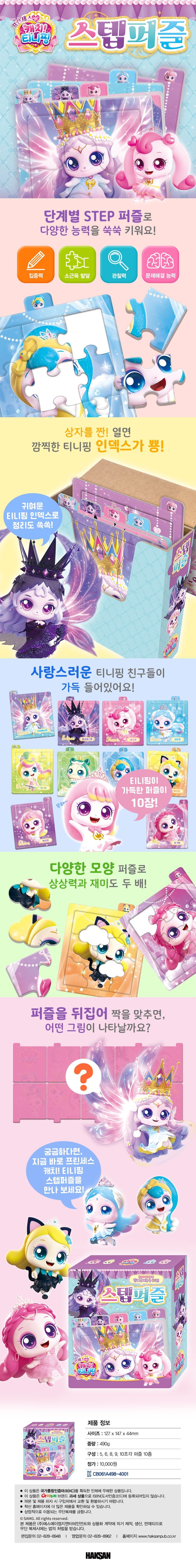 상자를 열면 깜찍한 티니핑 인덱스가 뿅!귀여운 티니핑 인덱스로 쏙쏙 정리하는 단계별 퍼즐놀이!5, 6, 8, 9, 10조각의 단계별 퍼즐이 총 10장 들어있어요.쉬운 난이도의 퍼즐부터 어려운 퍼즐까지 다양한 모양의 퍼즐들을차례대로 맞추다 보면 아이의 성취감이 쑥쑥!퍼즐을 다 맞췄다면, 퍼즐판에 있는 티니핑들의 설명을 읽어보고,퍼즐 뒷면의 그림도 맞춰보세요!