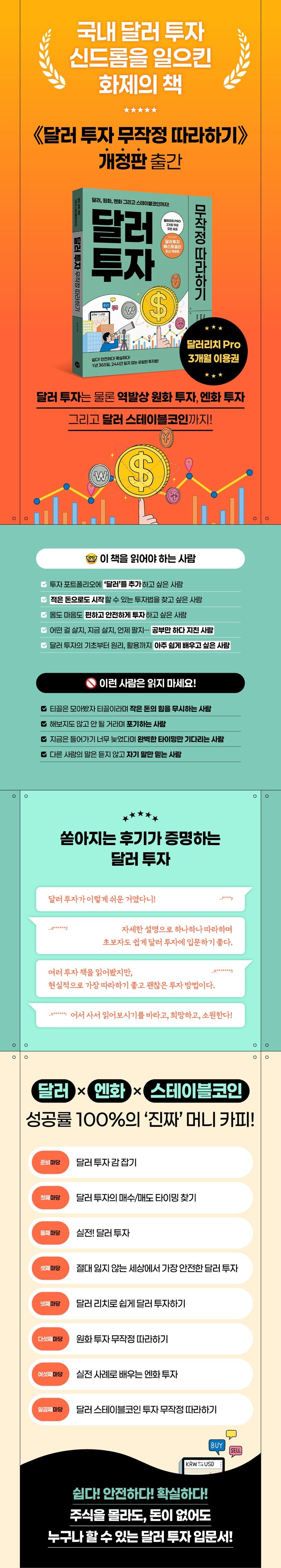 달러 투자를 위한 기초 지식부터 투자 원리, 매수 타이밍의 기준이 되는 데이터 보는 법, 세븐 스플릿하는 법 등 무작정 따라하기 코너를 통해 단계별로 하나씩 따라 하다 보면 달러 투자는 물론,