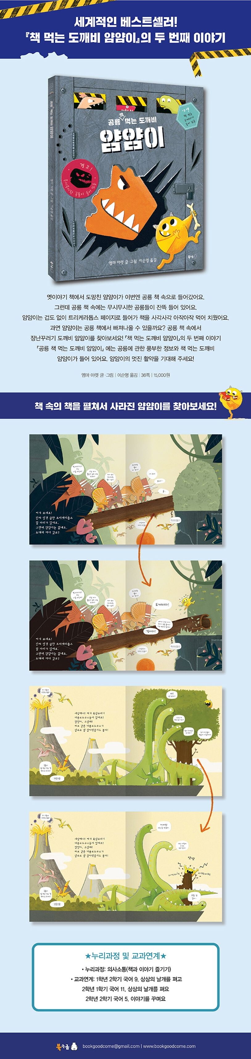 『책 먹는 도깨비 얌얌이』에서 책 먹는 것을 너무 좋아해서 옛이야기 책 속으로 들어가 악당들을 실컷 골탕 먹인 얌얌이를 기억하시나요? 얌얌이가 이번에는 무시무시한 공룡들이 사는 공룡 책 속으로 들어갔습니다. 그러더니 늘 그랬듯 공룡 책을 얌얌얌 갉아 먹어요.