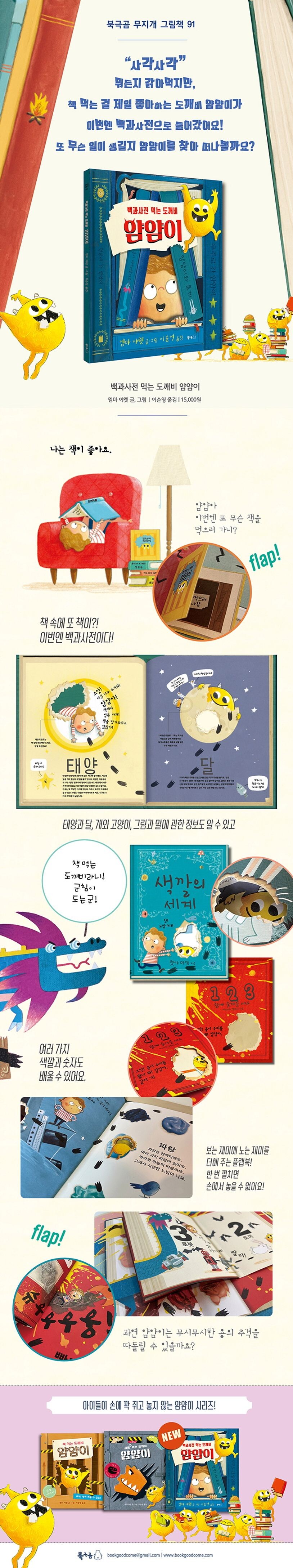 《백과사전 먹는 도깨비 얌얌이》는 책을 보는 재미와 책으로 노는 재미를 더해 주는 플랩북이에요. 책 속에 숨어 있는 얌얌이를 찾으러 플랩을 들어 올리고, 잘려 나가거나 구멍난 페이지를 넘기면서 능동적인 책 읽기를 경험할 수 있어요. 다양한 상상력을 자극하는 플랩과 함께 생동감 넘치고 흥미진진한 이야기를 만나 보세요!