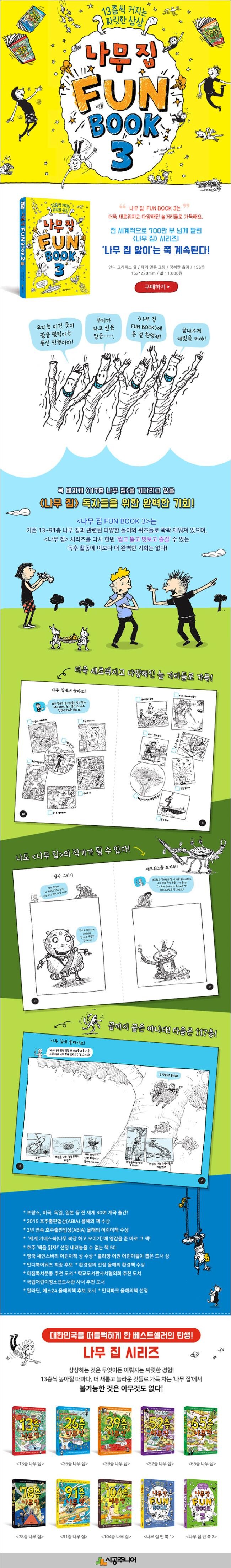 13층씩 커지는 [나무 집]을 계속해서 지켜본 독자들이라면 ‘나도 앤디와 테리 같은 작가가 되고 싶다’고, 한 번쯤은 꿈꿔 봤을 것이다. [나무 집 FUN BOOK]은 그런 독자들의 꿈을 단박에 이루어 준다. 독자들은 앤디처럼 글을 쓰고 테리처럼 그림을 그리며 한 권의 책을 완성하는 작가가 되어 볼 수 있다. 그 과정에서 아이들은 잠재돼 있던 상상력과 창의력을 자연스레 발현시키게 된다. 게다가 나무 집과 관련된 다양한 놀이와 퀴즈를 접하면서, 줄거리와 감상을 적는 일반적인 독후 활동과는 전혀 다른 재미와 즐거움을 맛볼 수 있다. 더욱이 이번에 새롭게 선보이는 ‘스도쿠’나 ‘그림 퍼즐’은 문제 해결에 있어 나무 집을 잘 알아야 한다는 전제 조건이 필요한 퀴즈들이라, 지금의 교육 현장에서 요구하는 복합적 사고 향상에도 도움이 된다. 하지만 가장 중요한 것은 [나무 집 FUN BOOK]에서의 모든 활동이 ‘FUN’하다는 점이다.