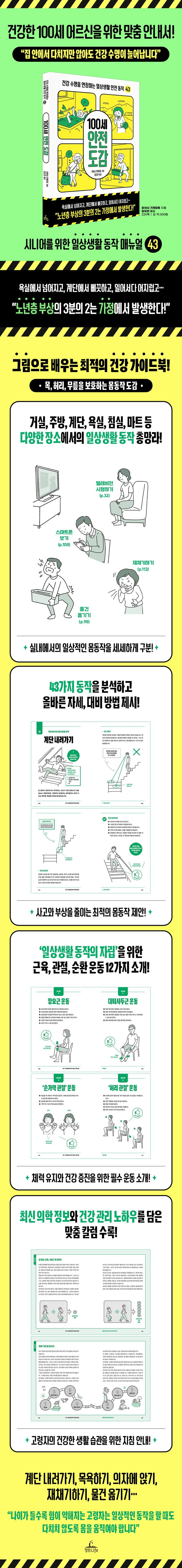 《100세 안전 도감》은 체력 유지에 필수적이면서도 간편하게 할 수 있는 ‘근육 운동’ 2가지, ‘관절 운동’ 9가지, ‘순환 운동’ 1가지도 소개한다. 몸의 중심을 잡고 안정된 자세를 유지하는 데 핵심인 ‘장요근’과 ‘대퇴사두근’을 단련하는 방법, 목, 어깨, 손가락, 무릎, 발목 등 9개 관절의 유연성을 높이고 활동 범위를 넓히는 방법 등이 제시되어 있다. 이러한 운동을 언제, 어느 정도로 하면 되는지도 어르신의 눈높이에서 설명해 준다. 그 밖에도 시니어에게 꼭 필요한 최신 의학 정보와 마인드셋을 담은 칼럼 5편을 수록해, ‘75세 이후에도 기대 수명을 늘리는 방법’ ‘걷기와 스쾃중 먼저 하면 좋은 운동’ 등 고령자에게 필요한 맞춤 건강 상식을 알려 준다.